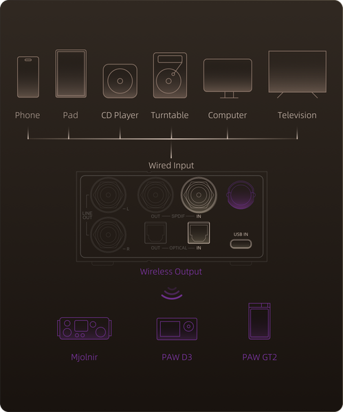 Die proprietäre LTTP-Drahtlostechnologie des PAW D3 gewährleistet true-lossless Audios-Streaming bis zu 96kHz/24bit, dynamische Anpassung der Bandbreite und Präzision der Uhren, um stabile, hochwertige Wiedergabe zu erhalten – selbst in herausfordernden drahtlosen Umgebungen.