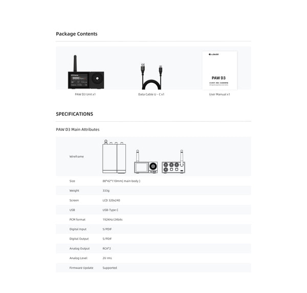 Egal, ob Sie ein High-End-Desktop-Audio-Setup aufbauen, Ihr mobiles Hörerlebnis verbessern oder die Freiheit von kabellosem Audio erkunden, der Lotoo PAW D3 ist Ihre All-in-One-Lösung. Mit seinen erstklassigen Komponenten, intelligentem Design und zukunftssicherer Firmware ist der Lotoo PawD3 gut aufgestellt.