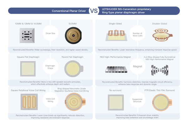 LETSHUOER employs a direct solder design for the voice coil circuitry on this planar driver. This structure effectively minimizes impedance, ensuring direct and highly efficient signal transmission. The process makes the driver less prone to oxidation, which not only enhances acoustic performance but also significantly extends the component's lifespan. From structural engineering to craftsmanship, this design elevates the fundamental capabilities of the sound.